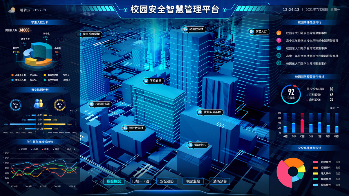 全方位立體式還原院區(qū)實貌,分圖層對院區(qū)的區(qū)域、建筑、單位、安防設(shè)備、管理設(shè)備、警情等進行查看、監(jiān)控和跟蹤;通過院區(qū)各類安防管理設(shè)備實時獲取各重點監(jiān)控區(qū)域的監(jiān)控數(shù)據(jù),對各種突發(fā)事件進行報警。通過人臉識別、車牌識別、行為識別、武器管理、營區(qū)設(shè)備等各類傳感器,對人、車、物及其行為的全面感知,保障營區(qū)安全。 -