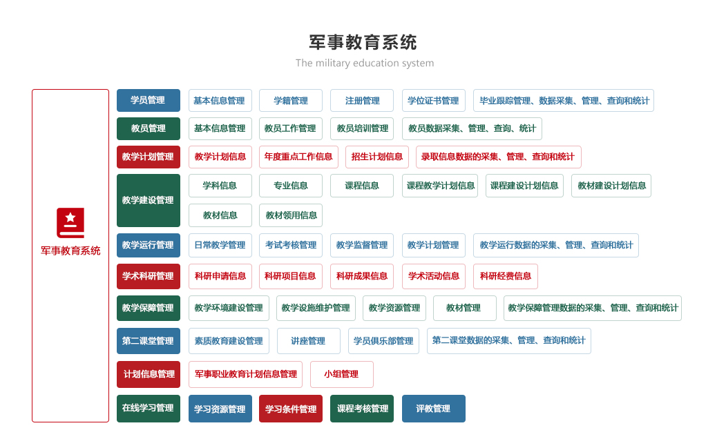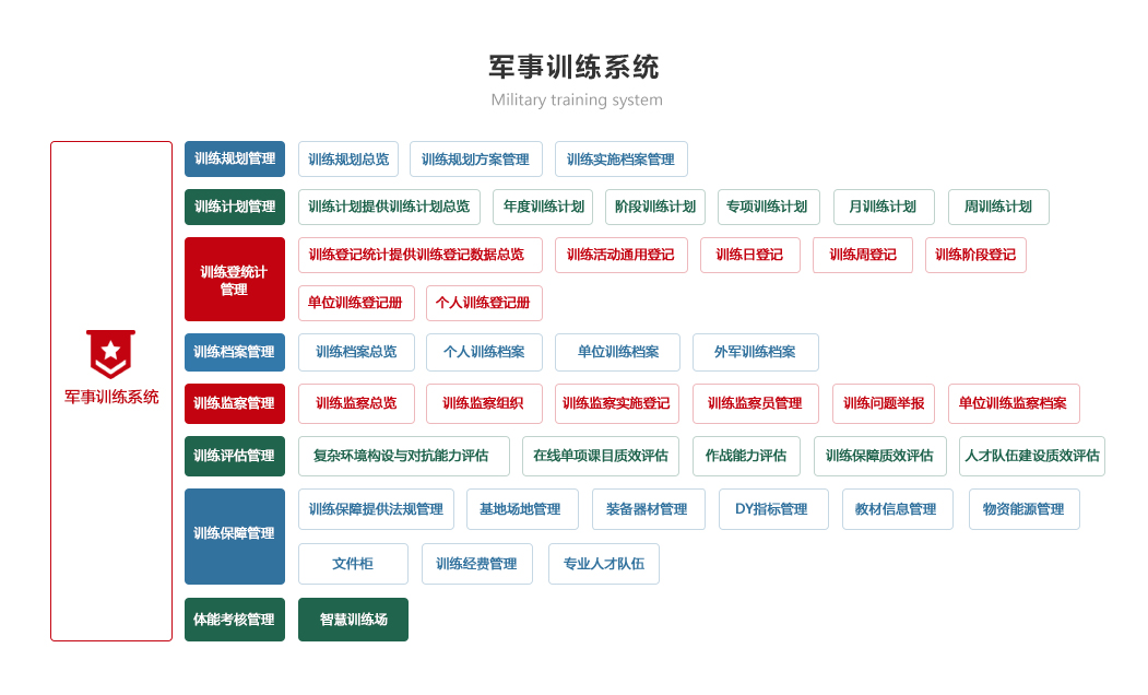 包括訓練計劃、訓練檢查、訓練考核、訓練檔案、訓練資源模塊,實現(xiàn)對訓練計劃制定情況自動統(tǒng)計和智能分析、逐步解決訓練時間、訓練人員落實情況、實現(xiàn)智能報靶和體能訓練監(jiān)測、實現(xiàn)網(wǎng)上模擬訓練與考核的智能化、自動化和便捷化,對訓練資源科學管理,確保為軍事訓練工作有力支撐。