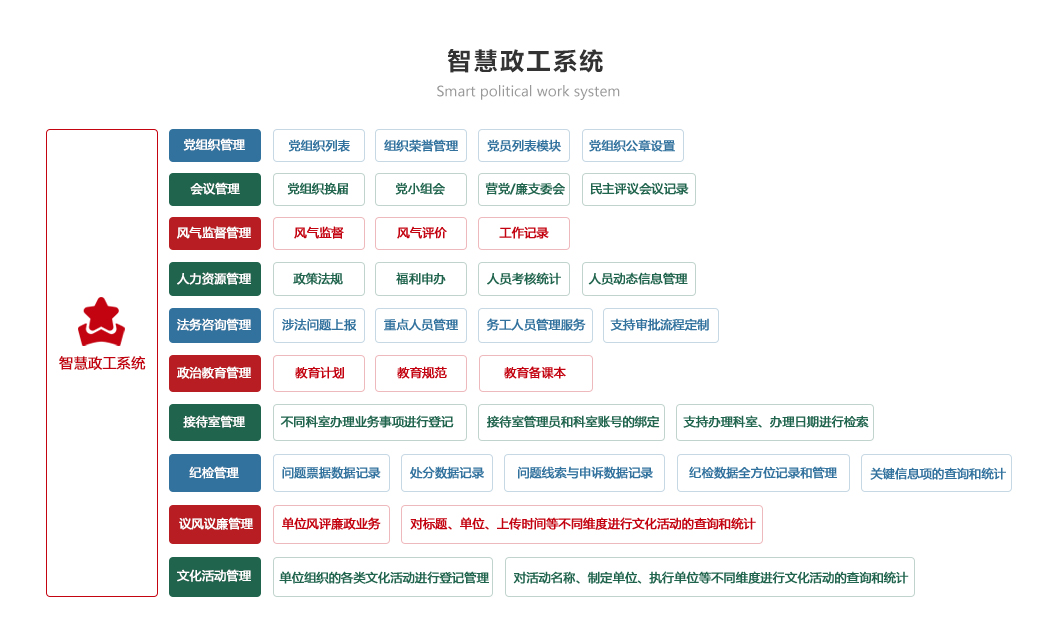 政治教育系統(tǒng)輔助政治機關(guān)做好人員思想常掌握、政治教育全覆蓋、人才培養(yǎng)見成效和黨建工作更務(wù)實,特別是依托新媒體,在手機上開展移動政治工作,激發(fā)官兵參與互動,主要包括人力資源、 組織建設(shè)、政治教育和保衛(wèi)工作功能。